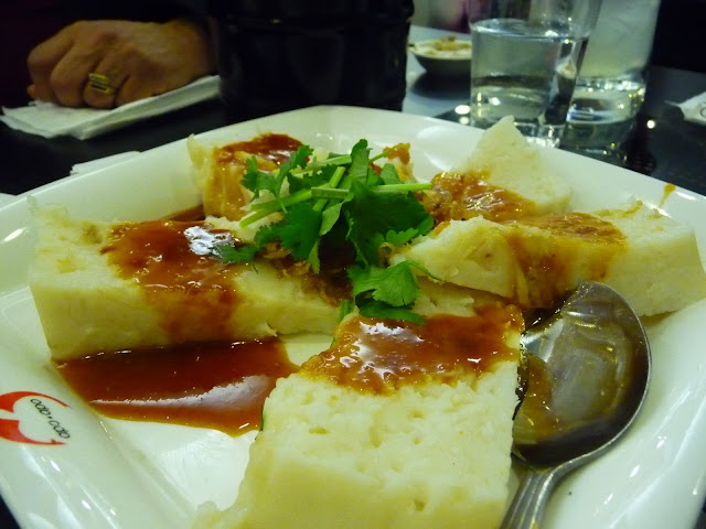 街下來這個是吃起來很像碗粿的東西 不過很大一盤, 這種斜切片的方式,